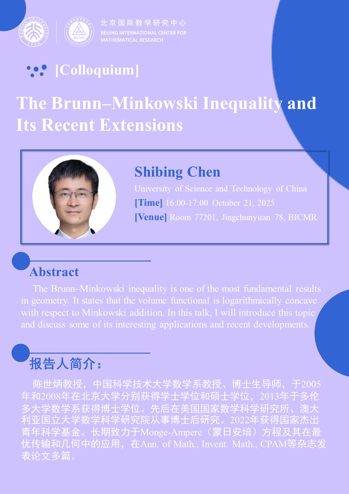 场地: 北京国际数学研究中心,镜春园78号院(怀新园)77201室