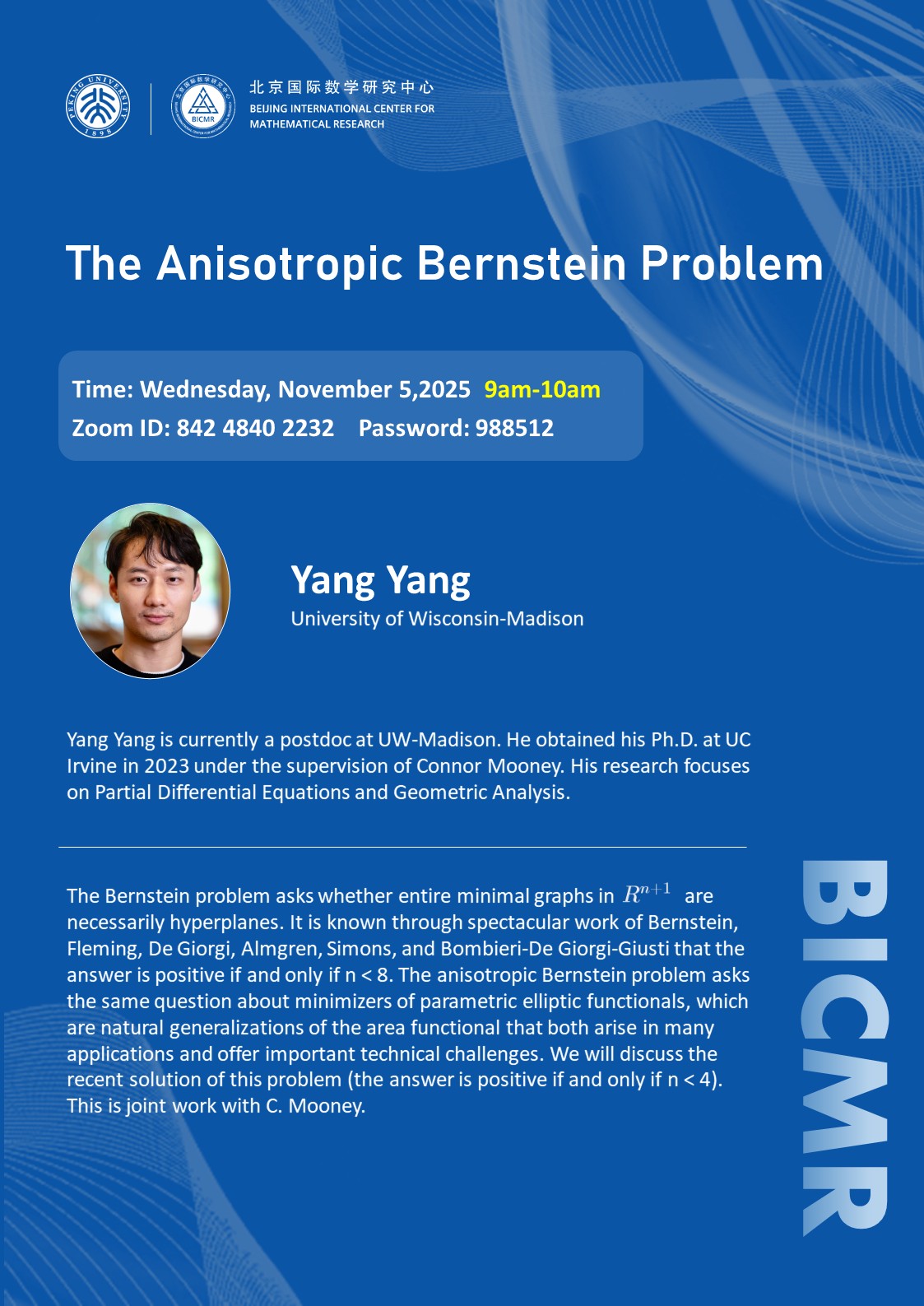 Yang Yang is currently a postdoc at UW-Madison. He obtained his Ph.D. at UC Irvine in 2023 under the supervision of Connor Mooney. His research focuses on Partial Differential Equations and Geometric Analysis.
