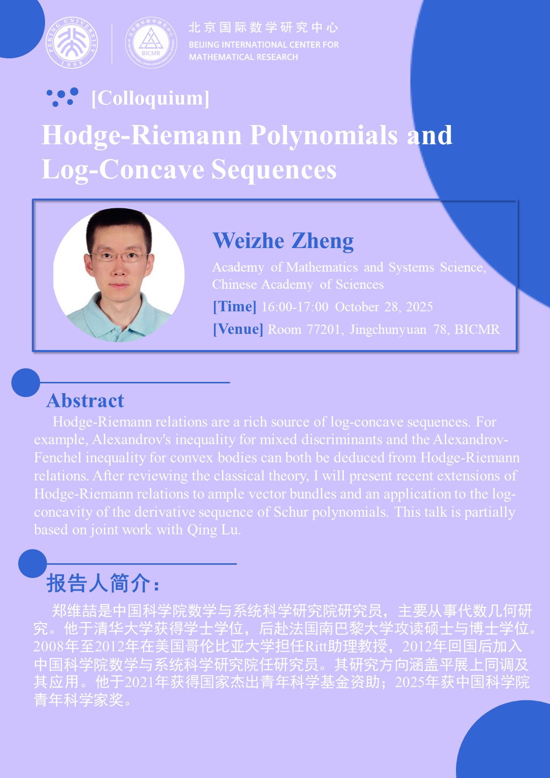 郑维喆是中国科学院数学与系统科学研究院研究员,主要从事代数几何研究。他于清华大学获得学士学位,后赴法国南巴黎大学攻读硕士与博士学位。2008年至2012年在美国哥伦比亚大学担任Ritt助理教授,2012年回国后加入中国科学院数学与系统科学研究院任研究员。其研究方向涵盖平展上同调及其应用。他于2021年获得国家杰出青年科学基金资助;2025年获中国科学院青年科学家奖。