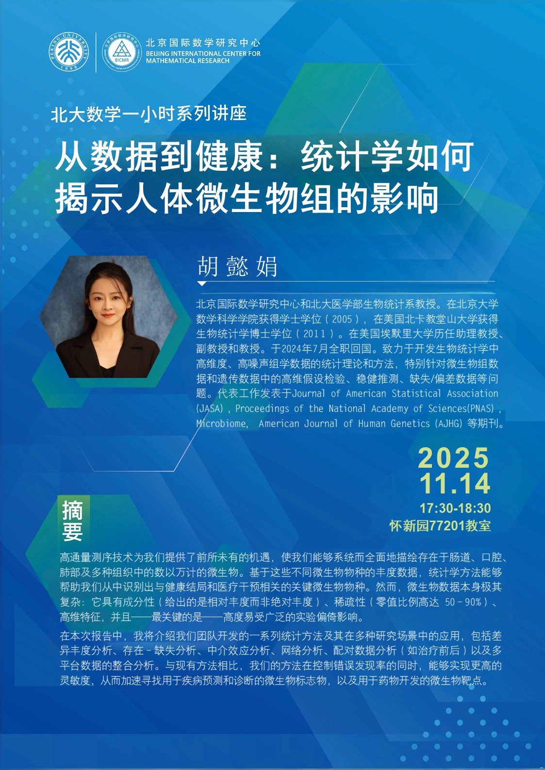报告人:胡懿娟,北京国际数学研究中心和北大医学部生物统计系教授。在北京大学数学科学学院获得学士学位(2005),在美国北卡教堂山大学获得生物统计学博士学位(2011)。在美国埃默里大学历任助理教授、副教授和教授。于2024年7月全职回国。致力于开发生物统计学中高维度、高噪声组学数据的统计理论和方法,特别针对微生物组数据和遗传数据中的高维假设检验、稳健推测、缺失/偏差数据等问题。代表工作发表于Journal of American Statistical Association (JASA) , Proceedings of the National Academy of Sciences(PNAS) , Microbiome, American Journal of Human Genetics (AJHG) 等期刊。