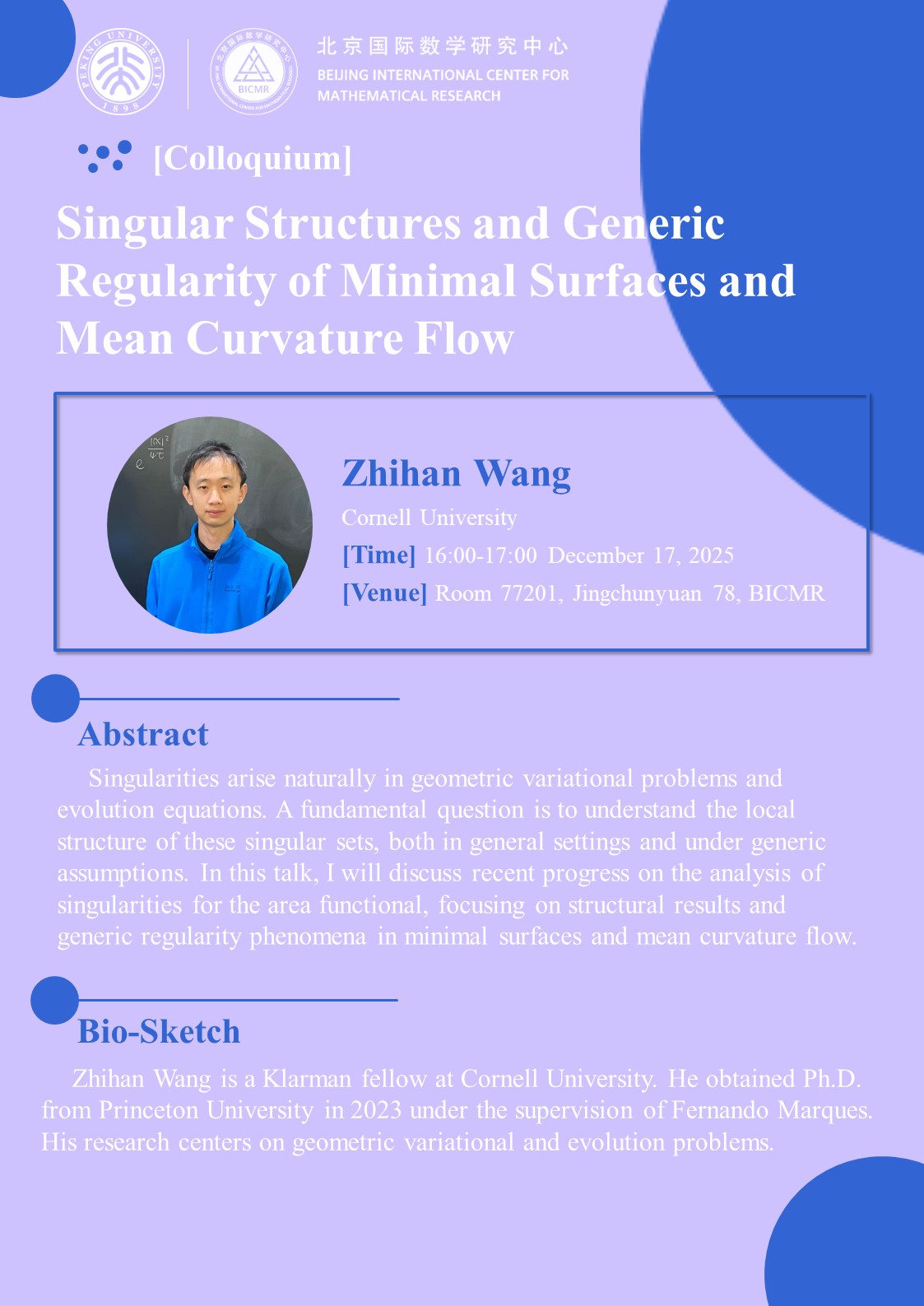 Zhihan Wang is a Klarman fellow at Cornell University. He obtained Ph.D. from Princeton University in 2023 under the supervision of Fernando Marques. His research centers on geometric variational and evolution problems.