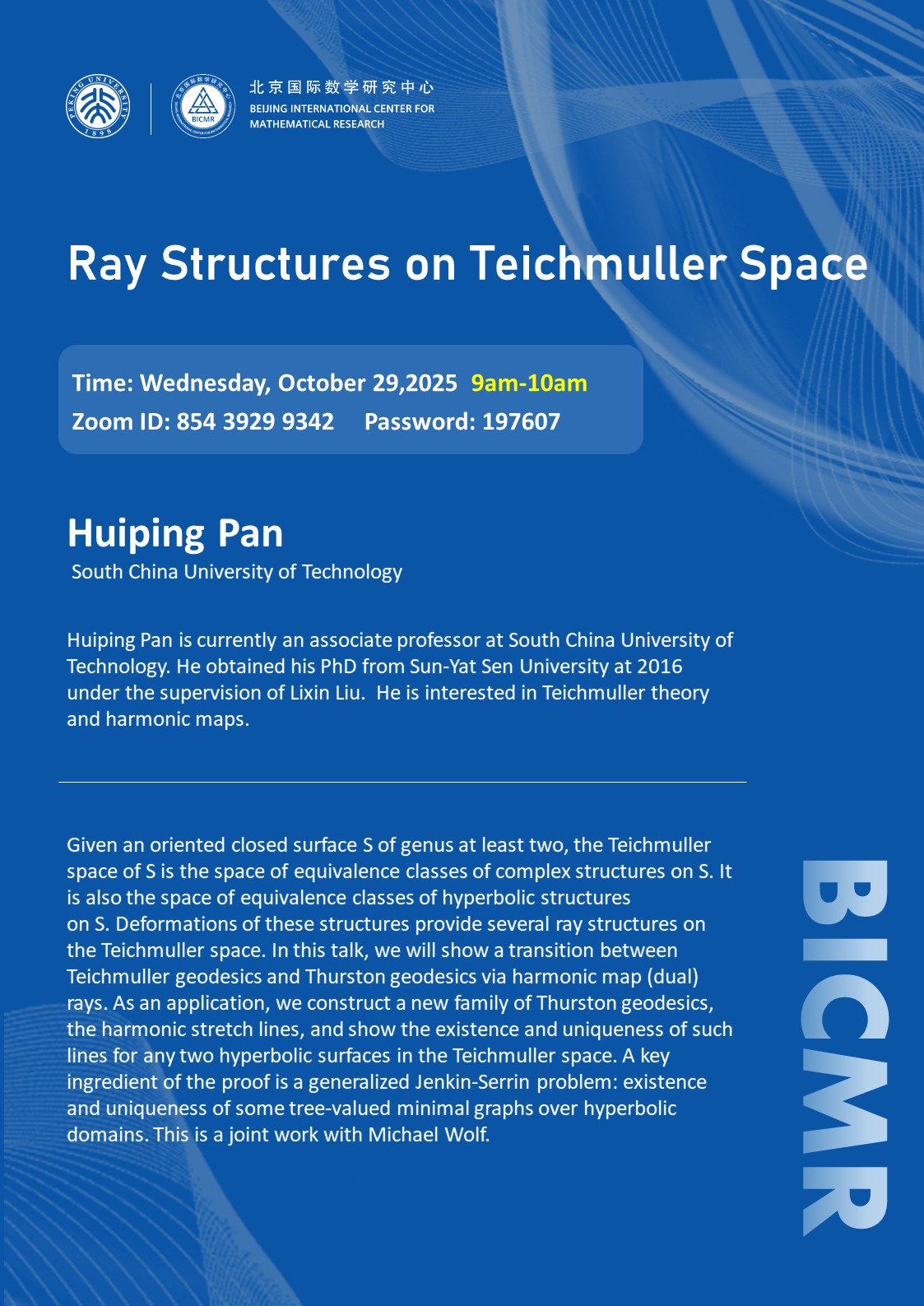 Huiping Pan is currently an associate professor at South China University of Technology. He obtained his PhD from Sun-Yat Sen University at 2016 under the supervision of Lixin Liu. He is interested in Teichmuller theory and harmonic maps.